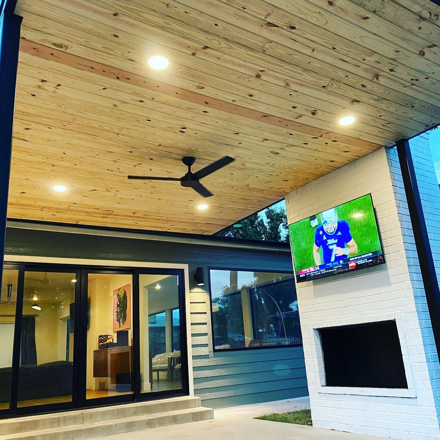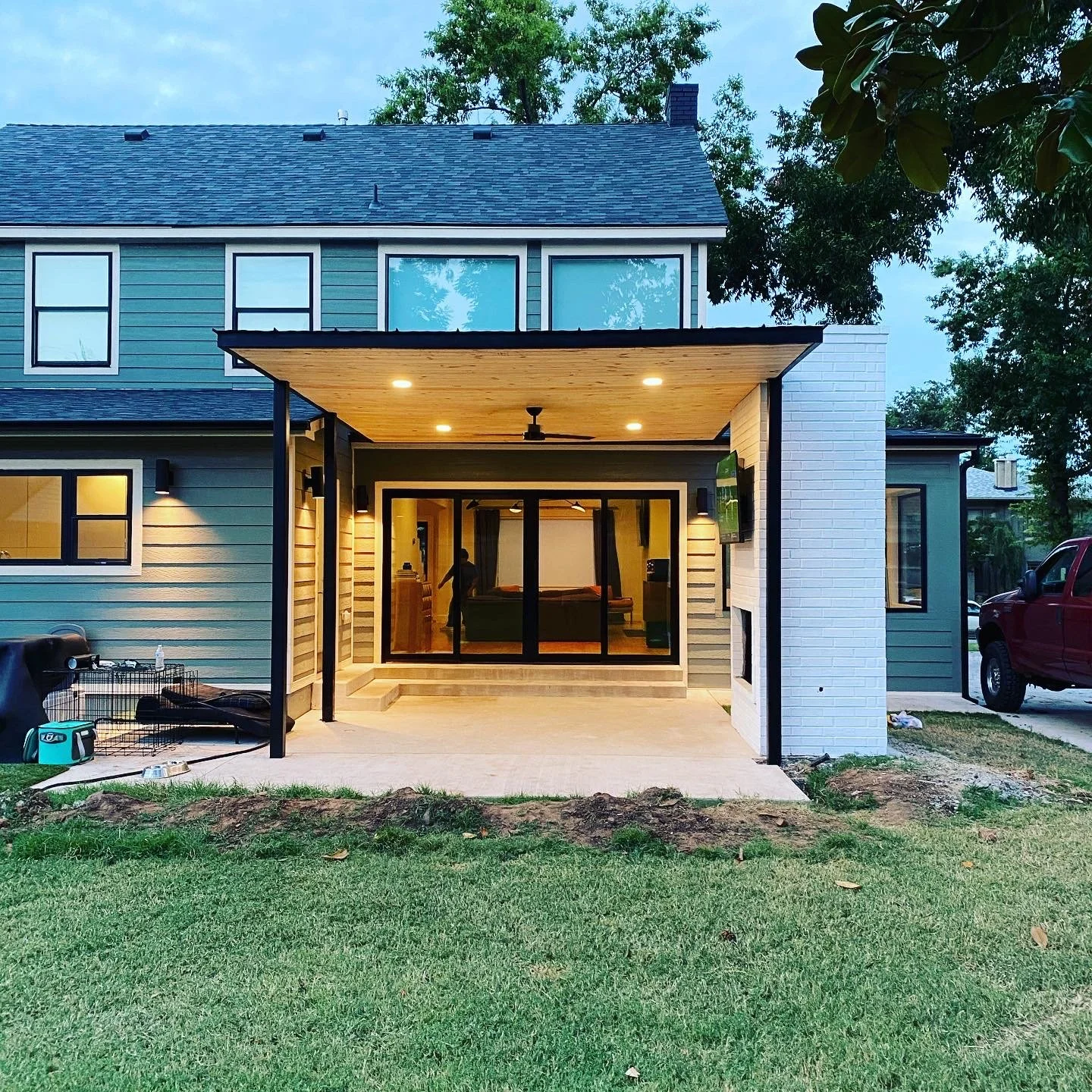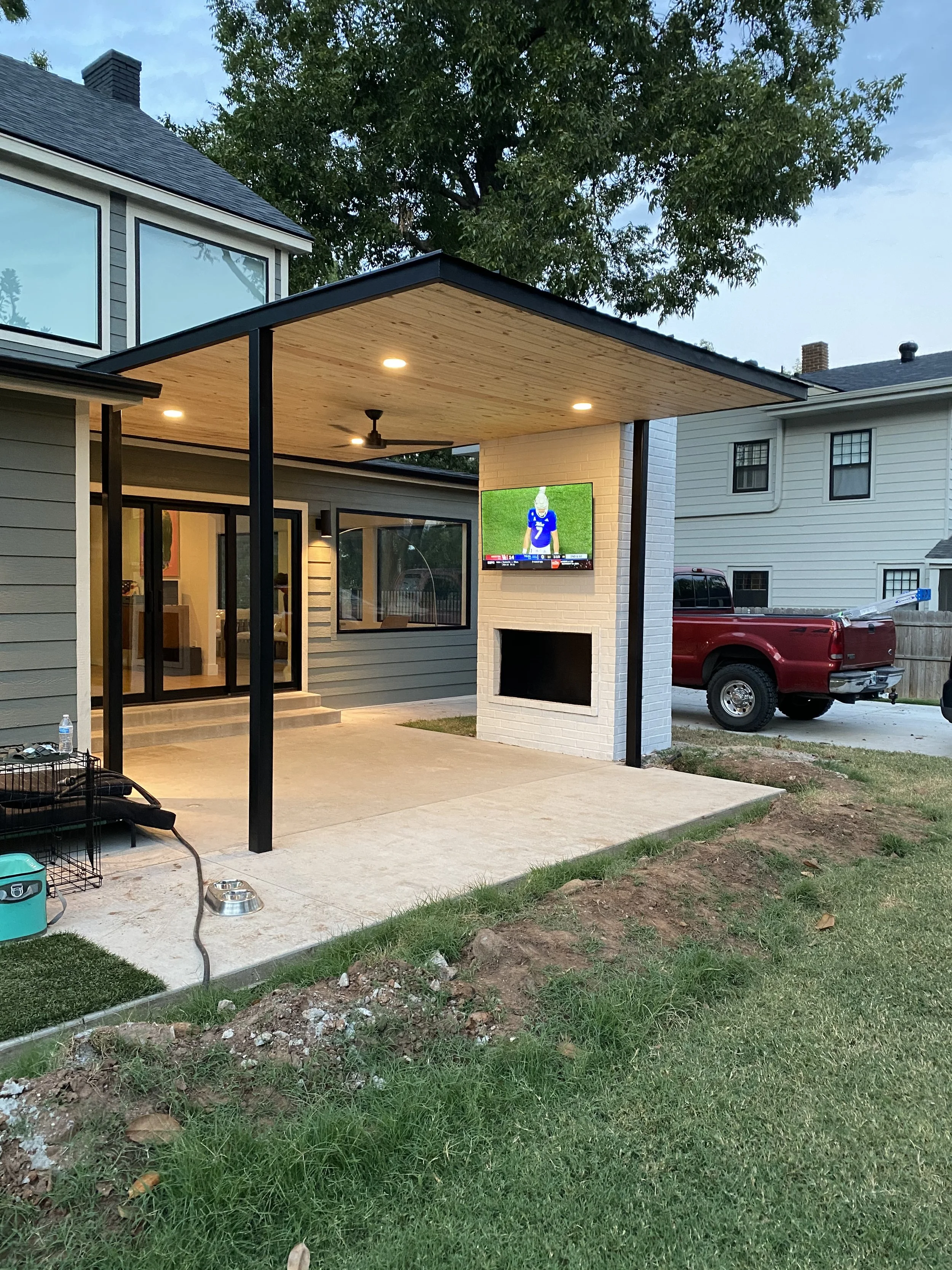 Steel Patio Cover & Fireplace15x20 Steel frame patio cover Lights and fan wiringTongue and groove ceiling $20,000